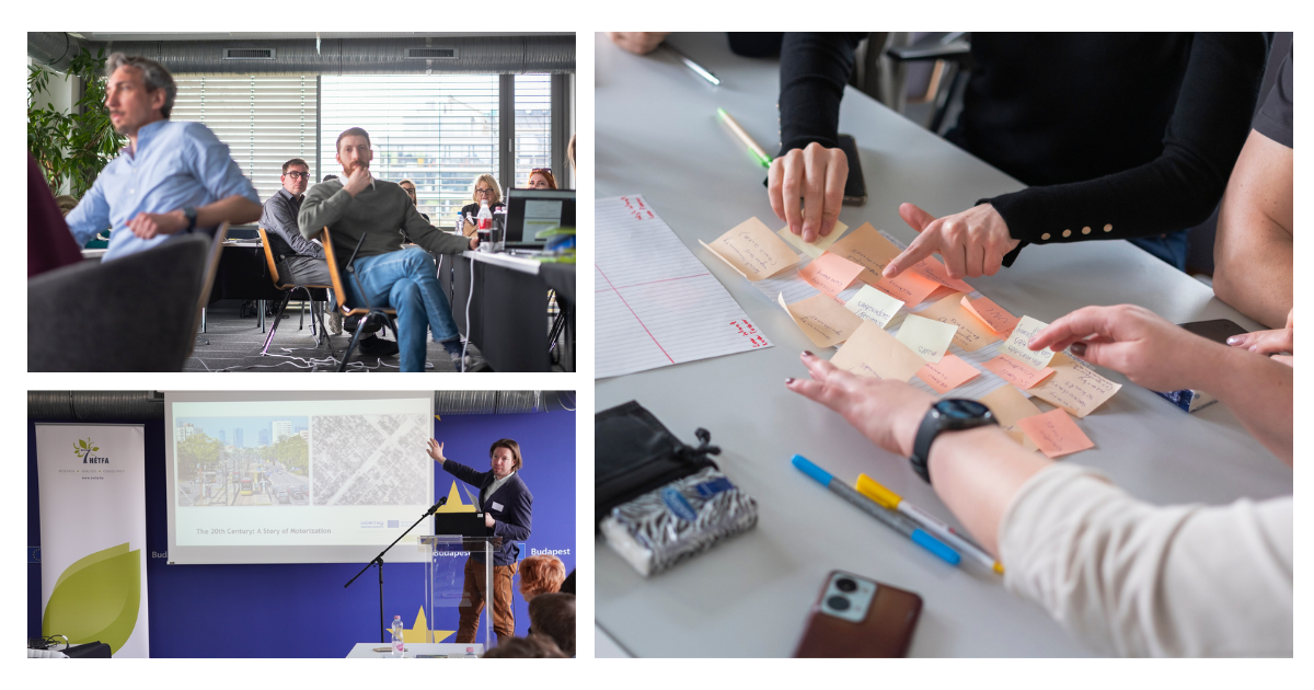 Az első napon a partnerek személyesen is megismerkedtek egymással, majd World Café formátumban dolgoztak a taktikai urbanizmus eszközein – a gyalogos élmény, a zöldítés és a kis léptékű urbanisztikai beavatkozások témáiban.